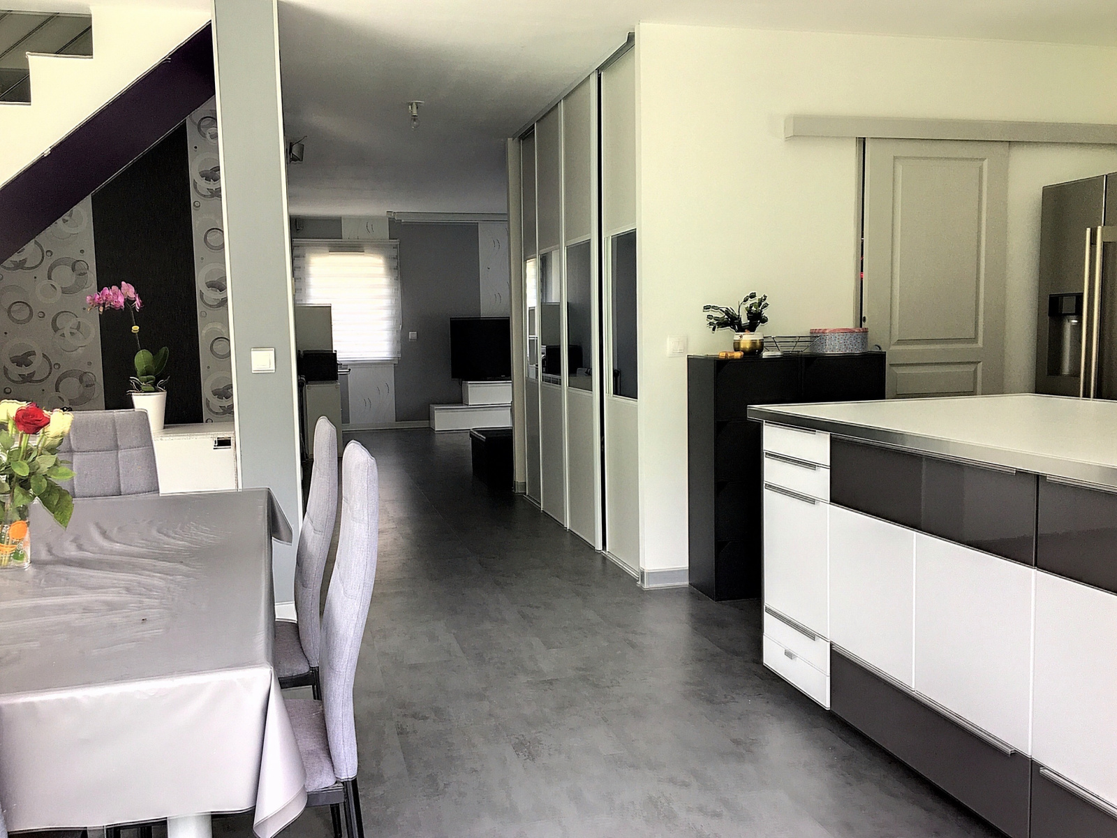 Au rez de chaussée : un hall d'entrée avec placard, une grande pièce de vie ouverte divisée en deux espaces : salle à manger et cuisine américaine toute équipée avec une buanderie et un vaste séjour, un dégagement dessert un wc, une salle d'eau et une chambre. A l'étage 4 chambres, un wc et une salle de bain.