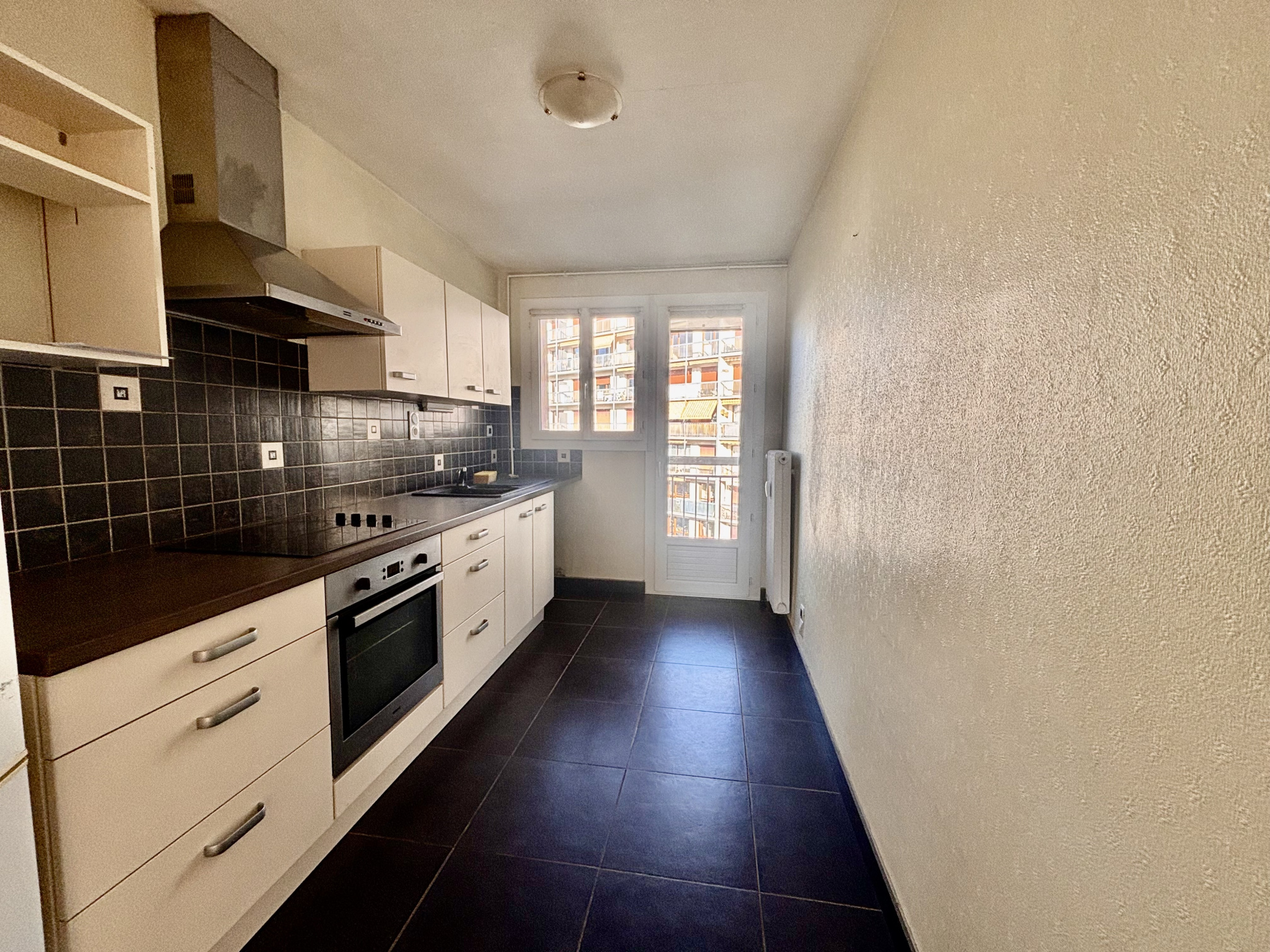 Une cuisine équipée, fonctionnelle et conviviale, ouvrant sur un second balcon