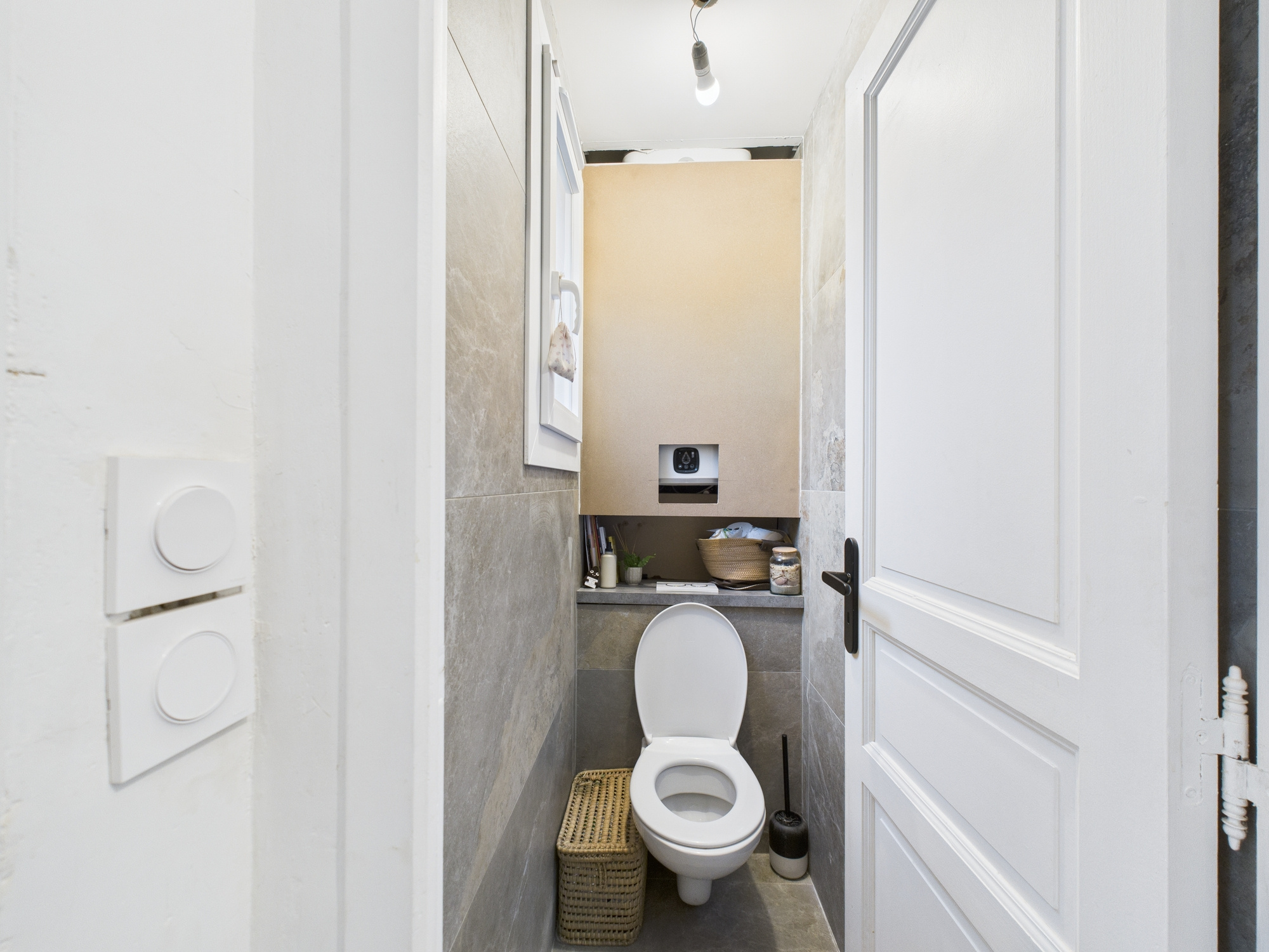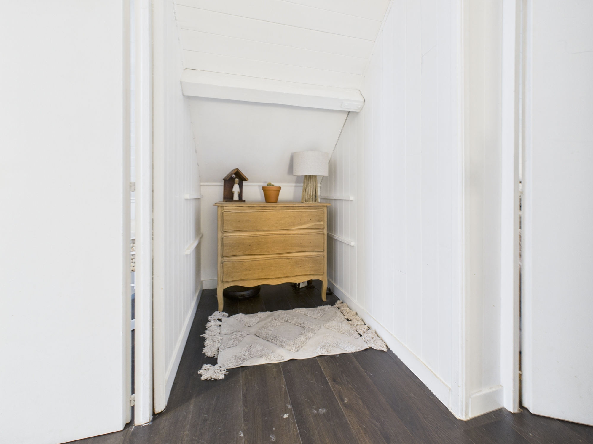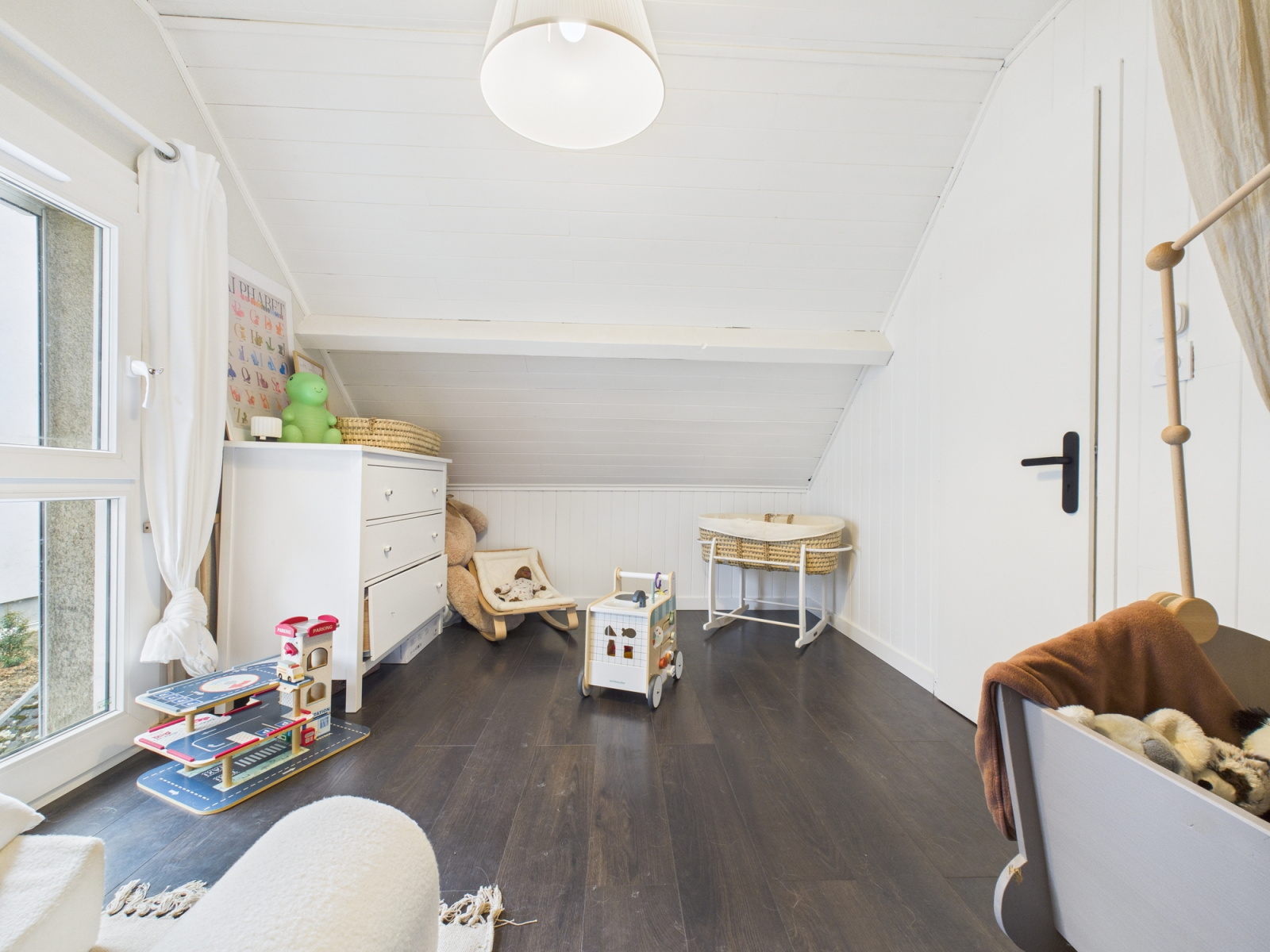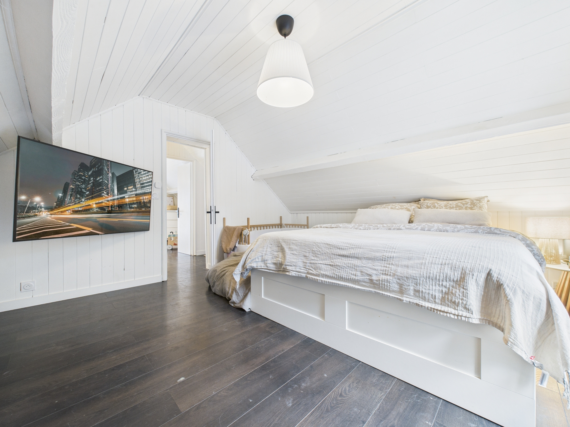 À l’étage, l’espace nuit se compose de deux chambres, dont l’une dispose d’un petit balcon, apportant une ouverture agréable sur l’extérieur.