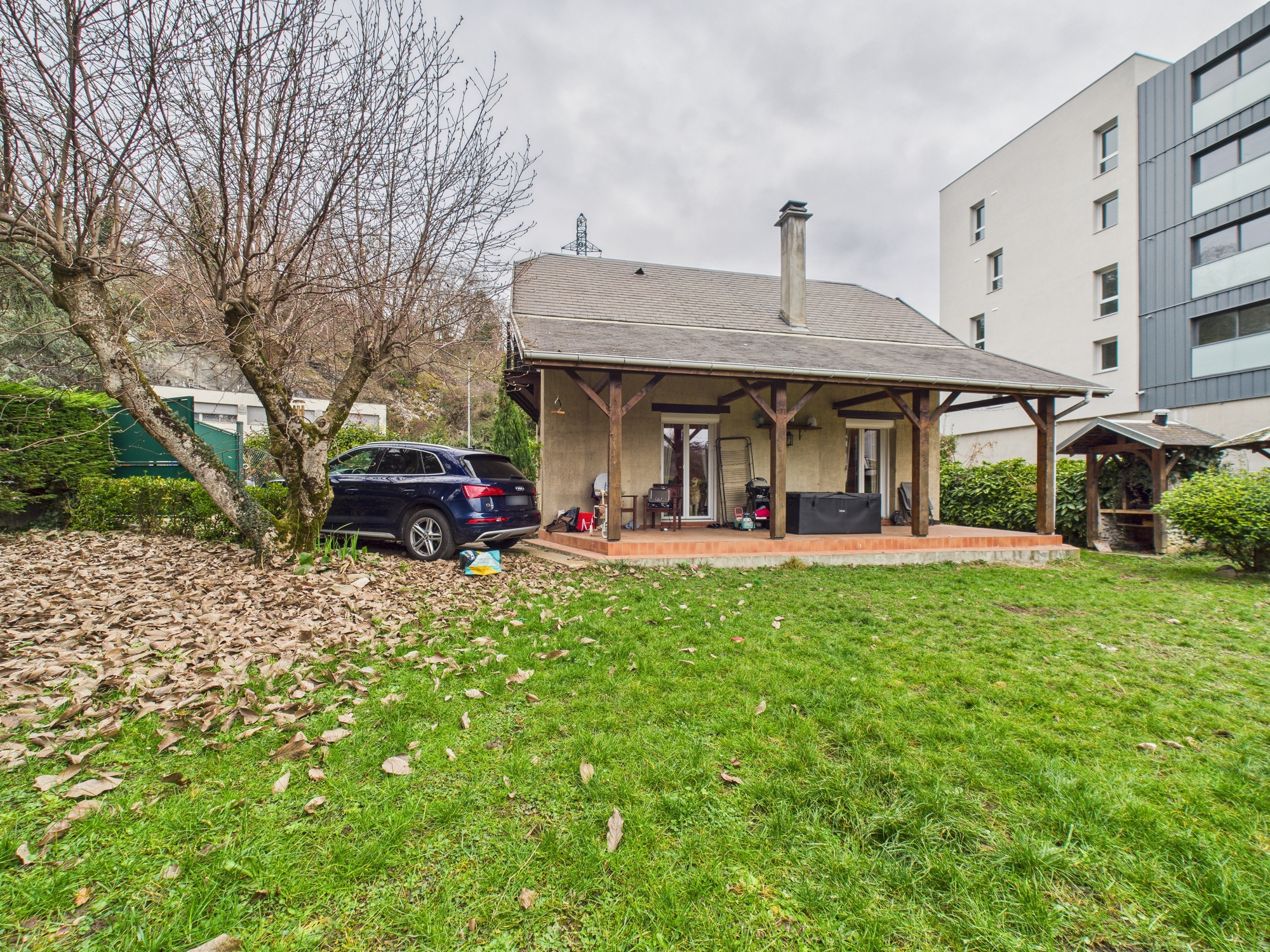 Le bien bénéficie également de trois places de stationnement et d’un jardin entièrement clôturé d’environ 645 m², offrant un bel espace extérieur.