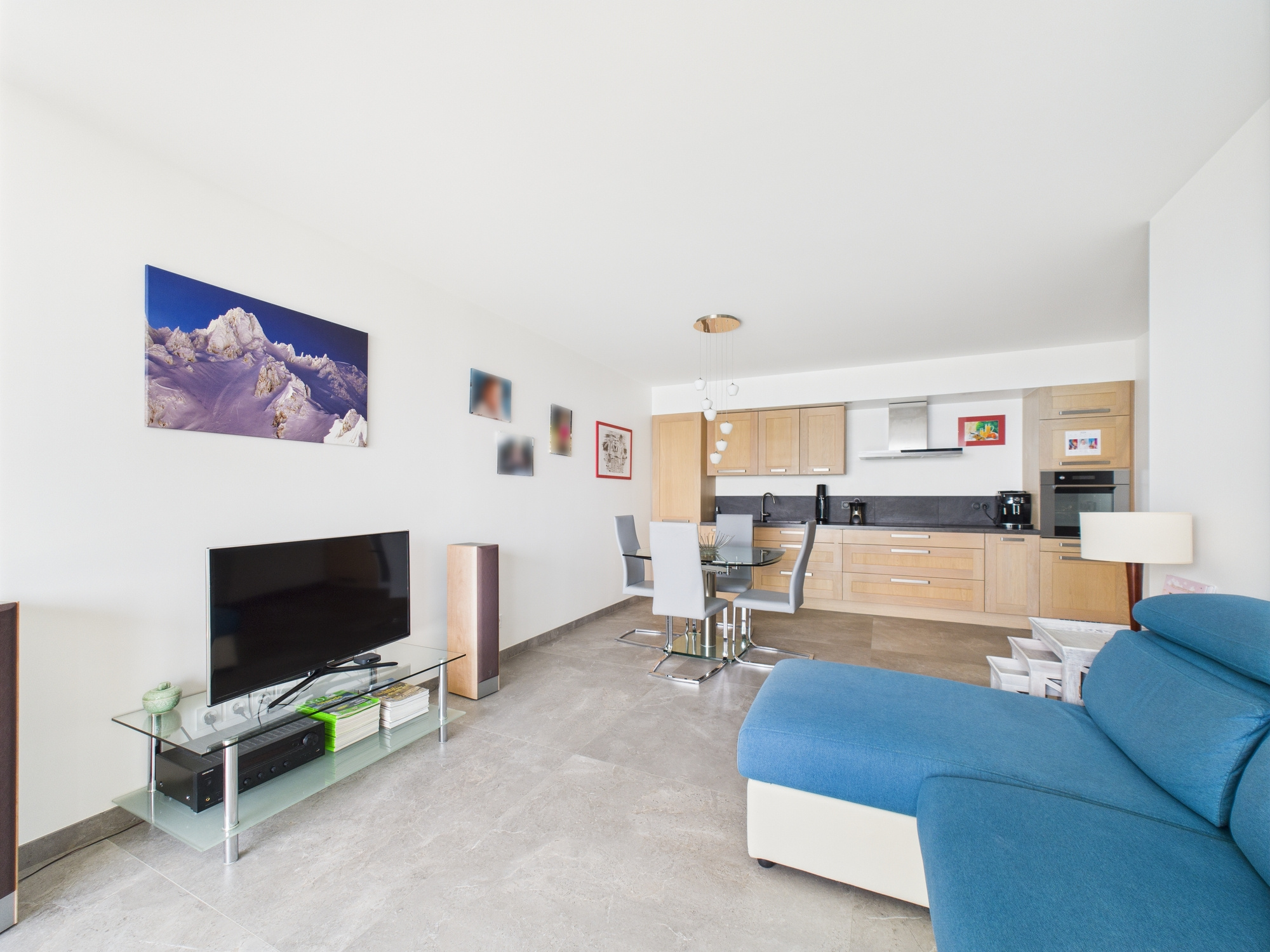 Ce bien se compose d'une cuisine Cuisinella aménagée et équipée, ouverte sur un salon-séjour lumineux, créant un espace de vie convivial et chaleureux.
