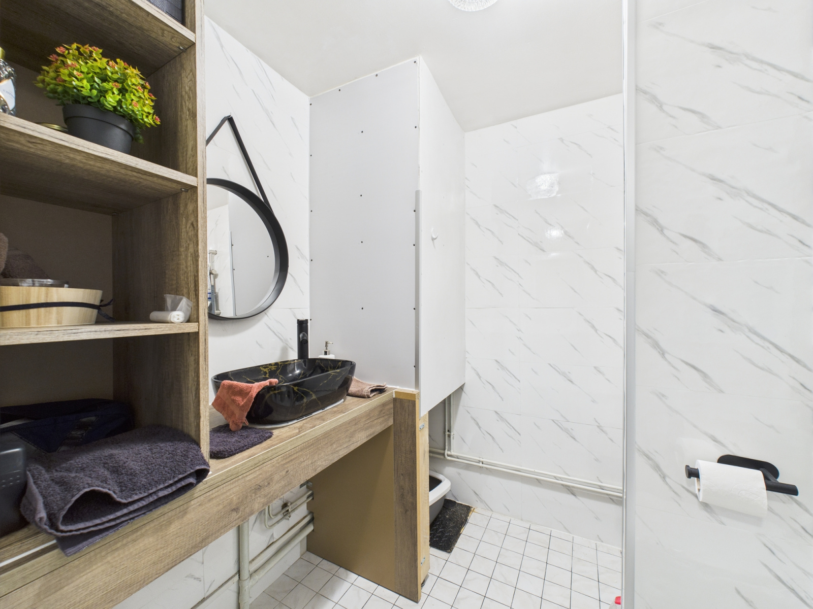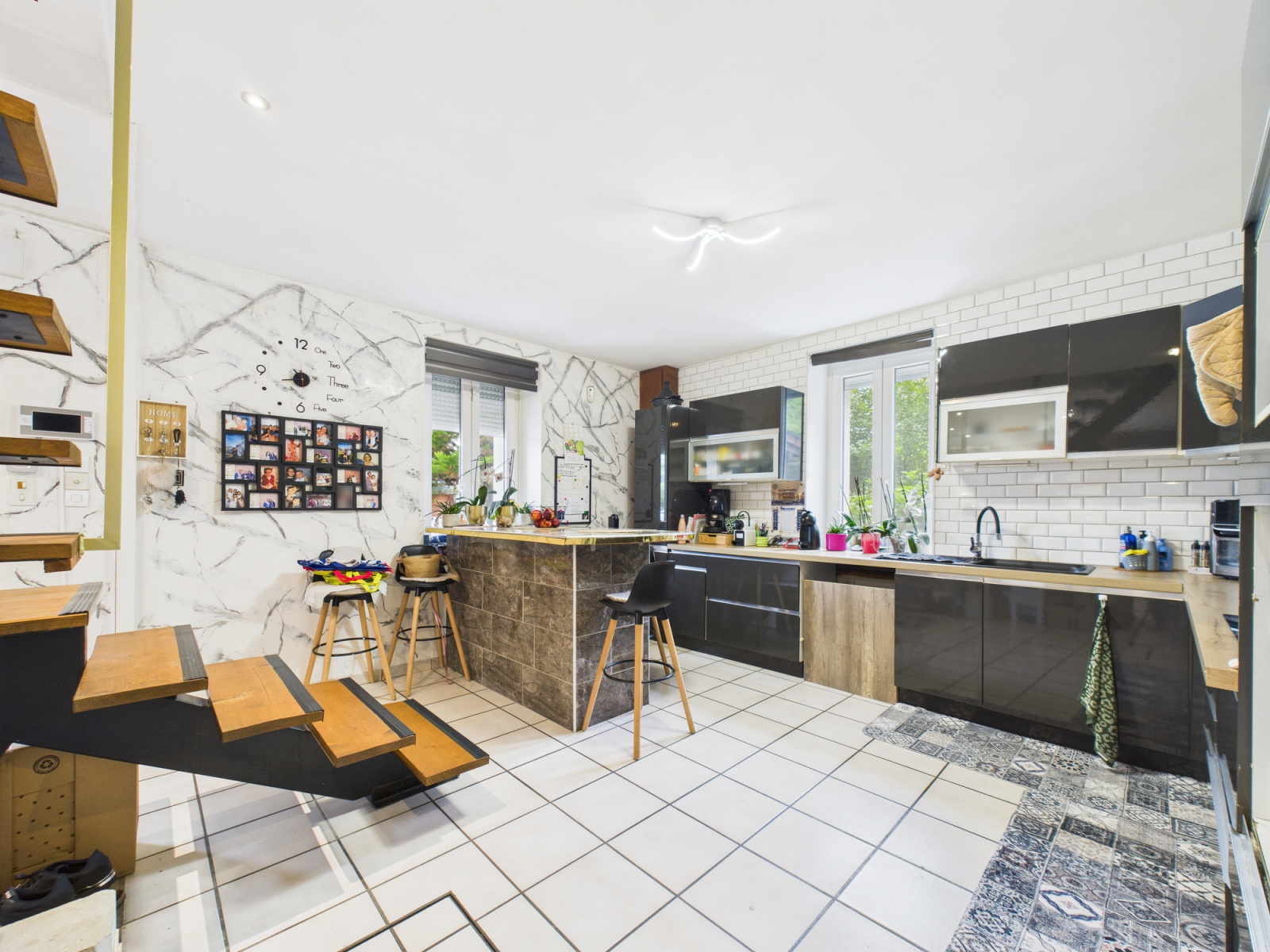 Une cuisine ouverte sur le séjour, une buanderie, une salle d'eau avec WC.