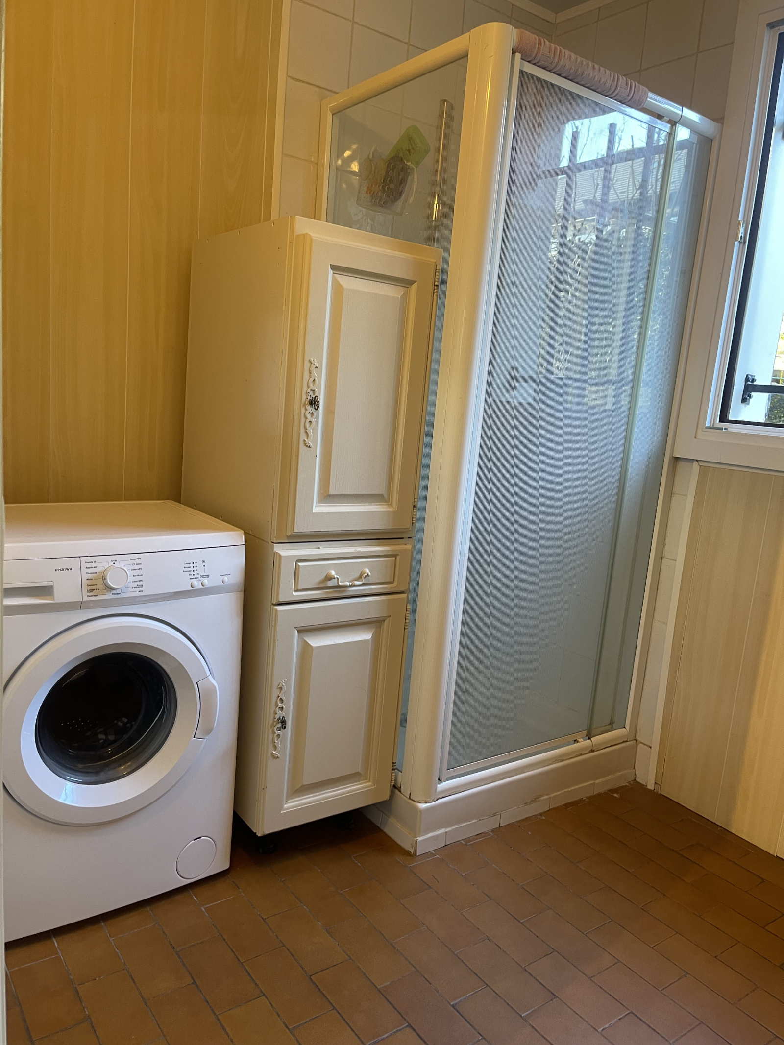 Devant la maison, environ 50 m2 sur lesquels vous pourrez garer 2 véhicules, devant le garage avec porte motorisée électrique. Du garage, vous pourrez aussi monter au 1er étage directement par un escalier.