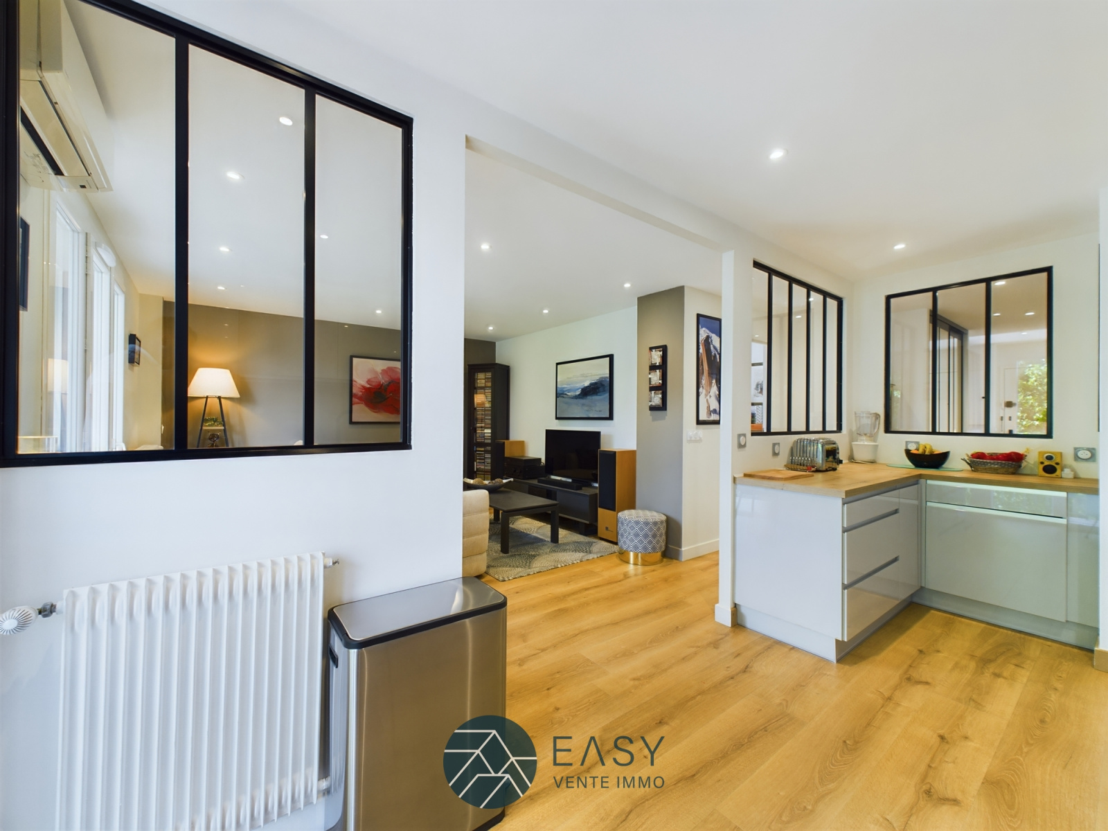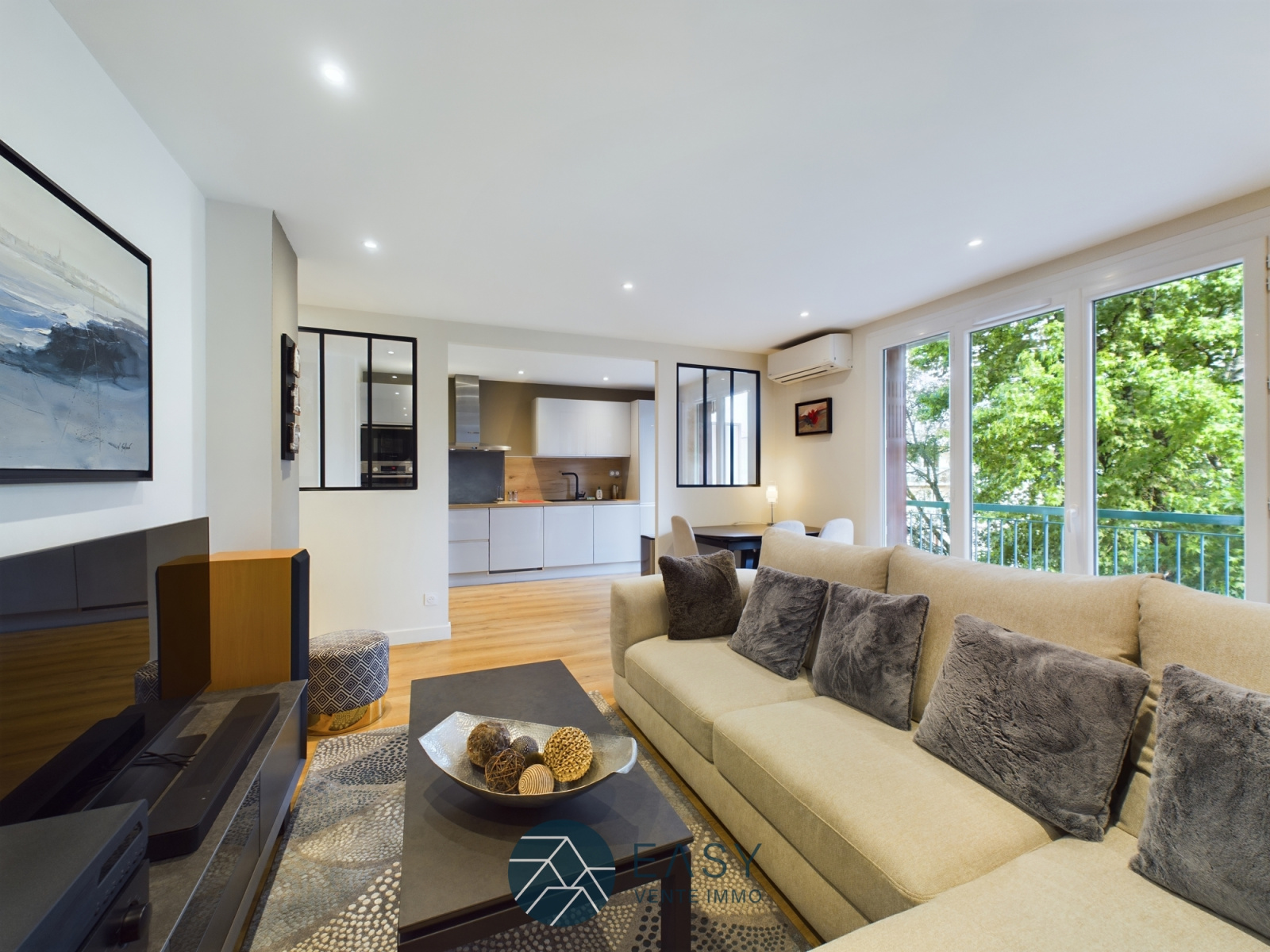 Cet appartement refait à neuf saura vous séduire par ses nombreux atouts. Pour commencer vous entrerez dans un couloir spacieux avec des rangements qui desservira dans l'ordre la chambre principale, la salle de bain, les WC séparés et la deuxième chambre, pour ensuite faire place à un magnifique salon cuisine ouverte avec de belles verrières. Le salon et la cuisine communiquent aussi via un balcon donnant sur un grand espace vert.