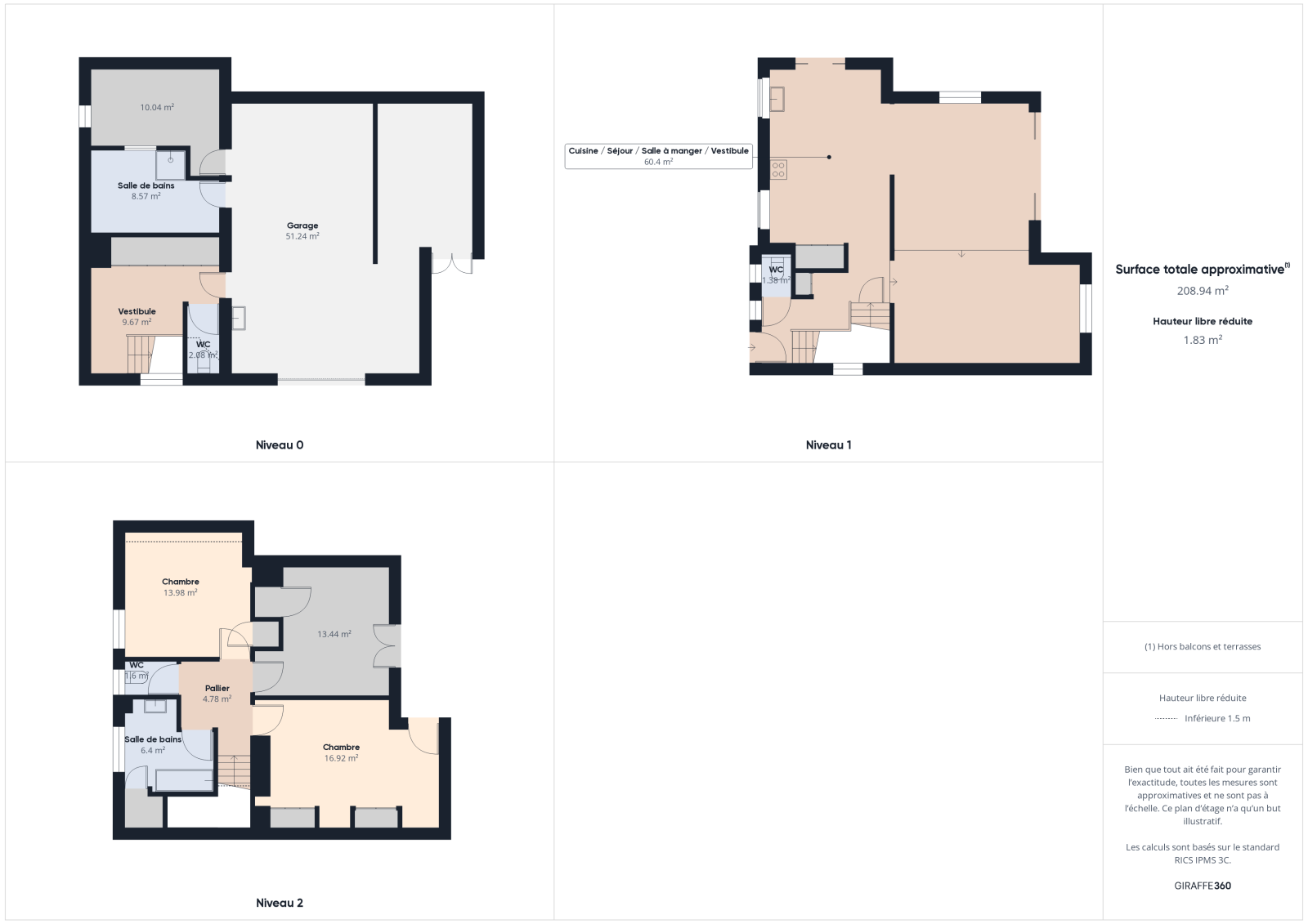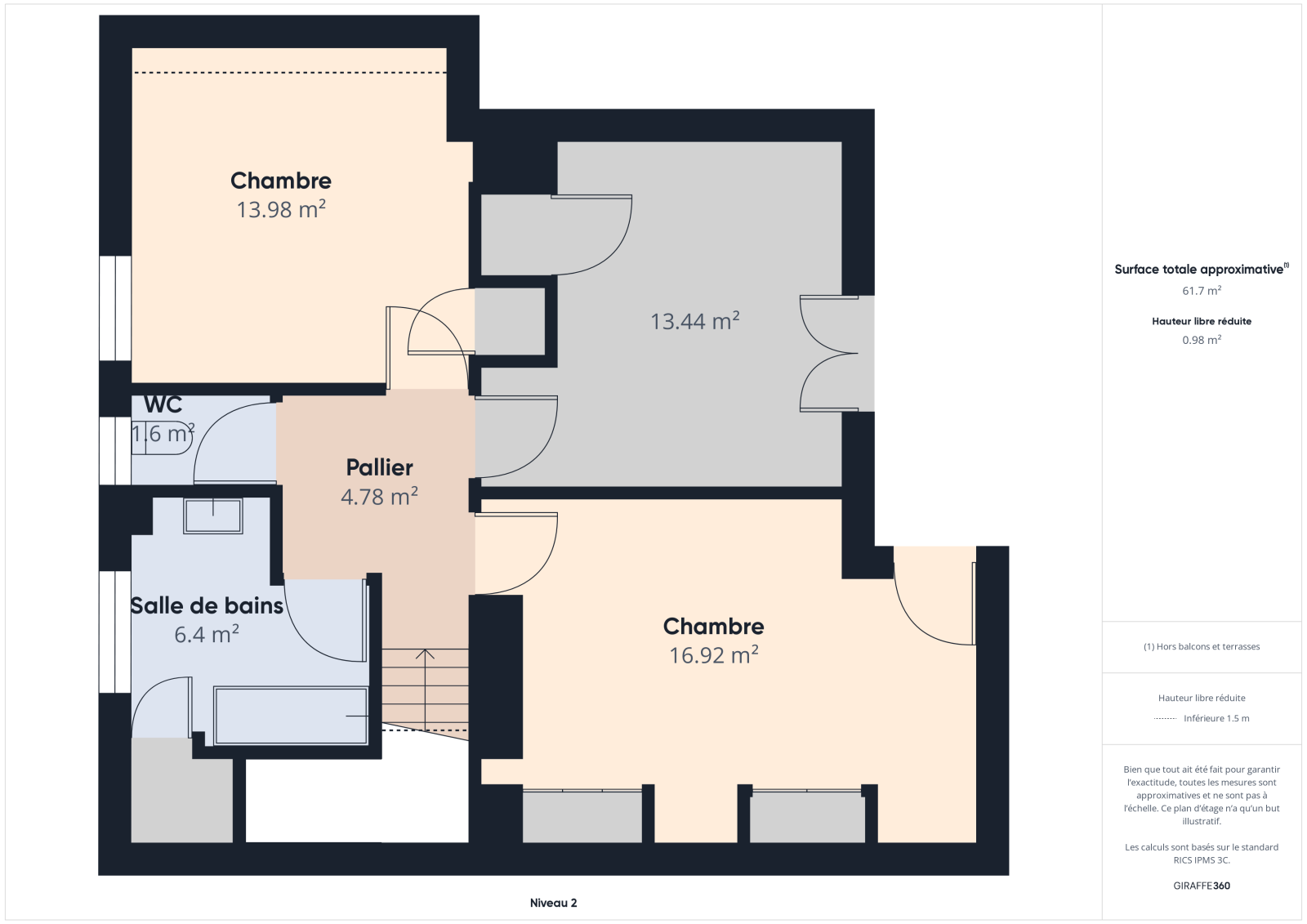 Au deuxième étage, l'espace nuit se compose de trois chambres spacieuses, dont deux avec mezzanine, offrant des espaces supplémentaires pour un coin bureau ou une aire de jeux. Un dégagement dessert également un WC indépendant et une salle de bains.