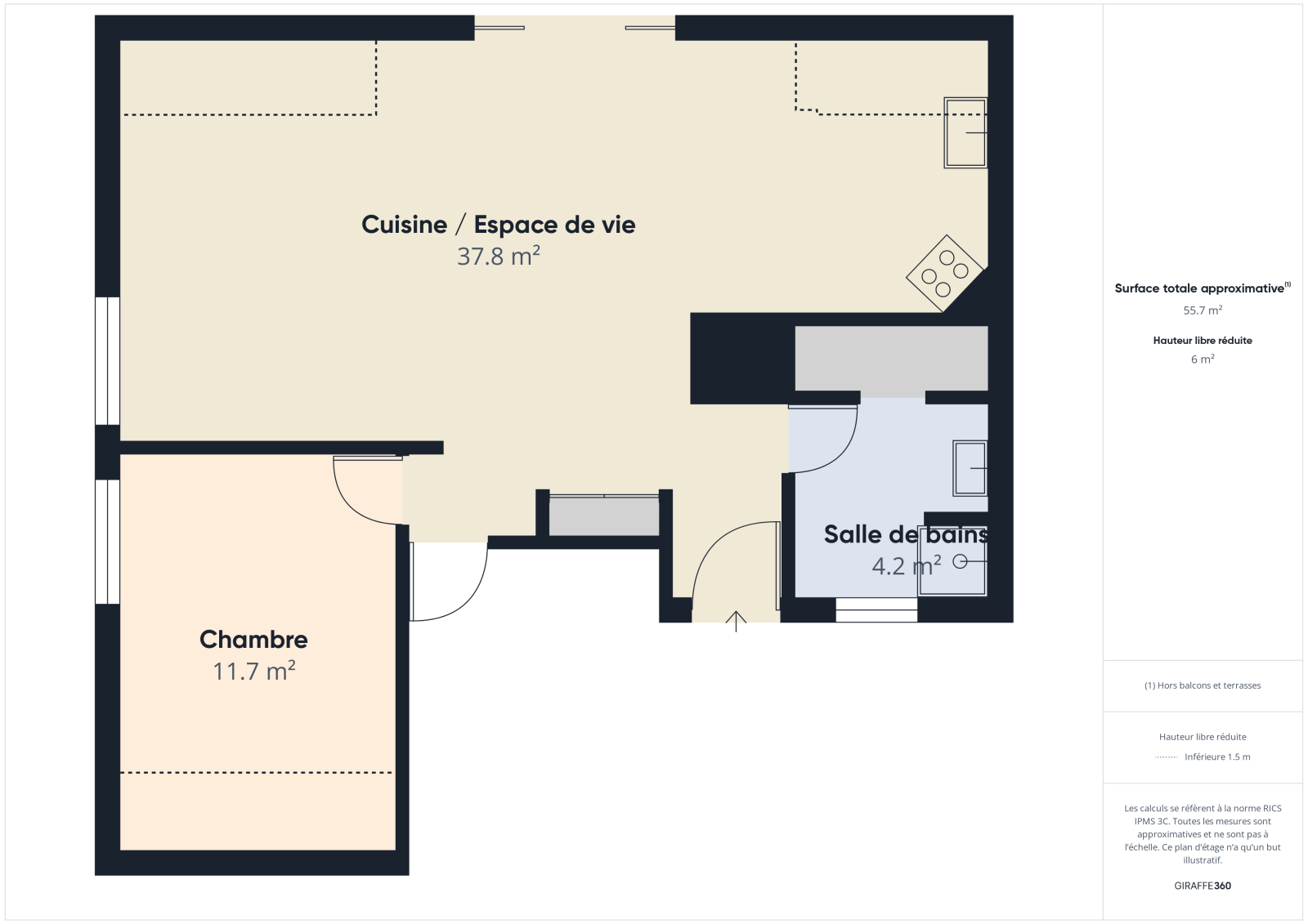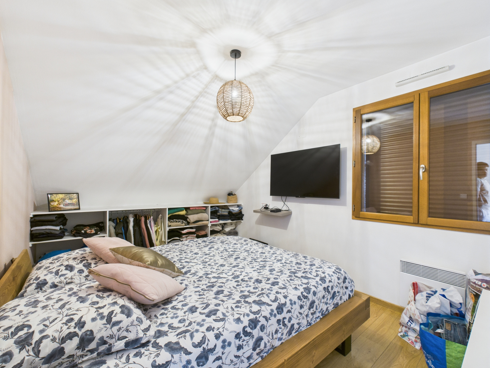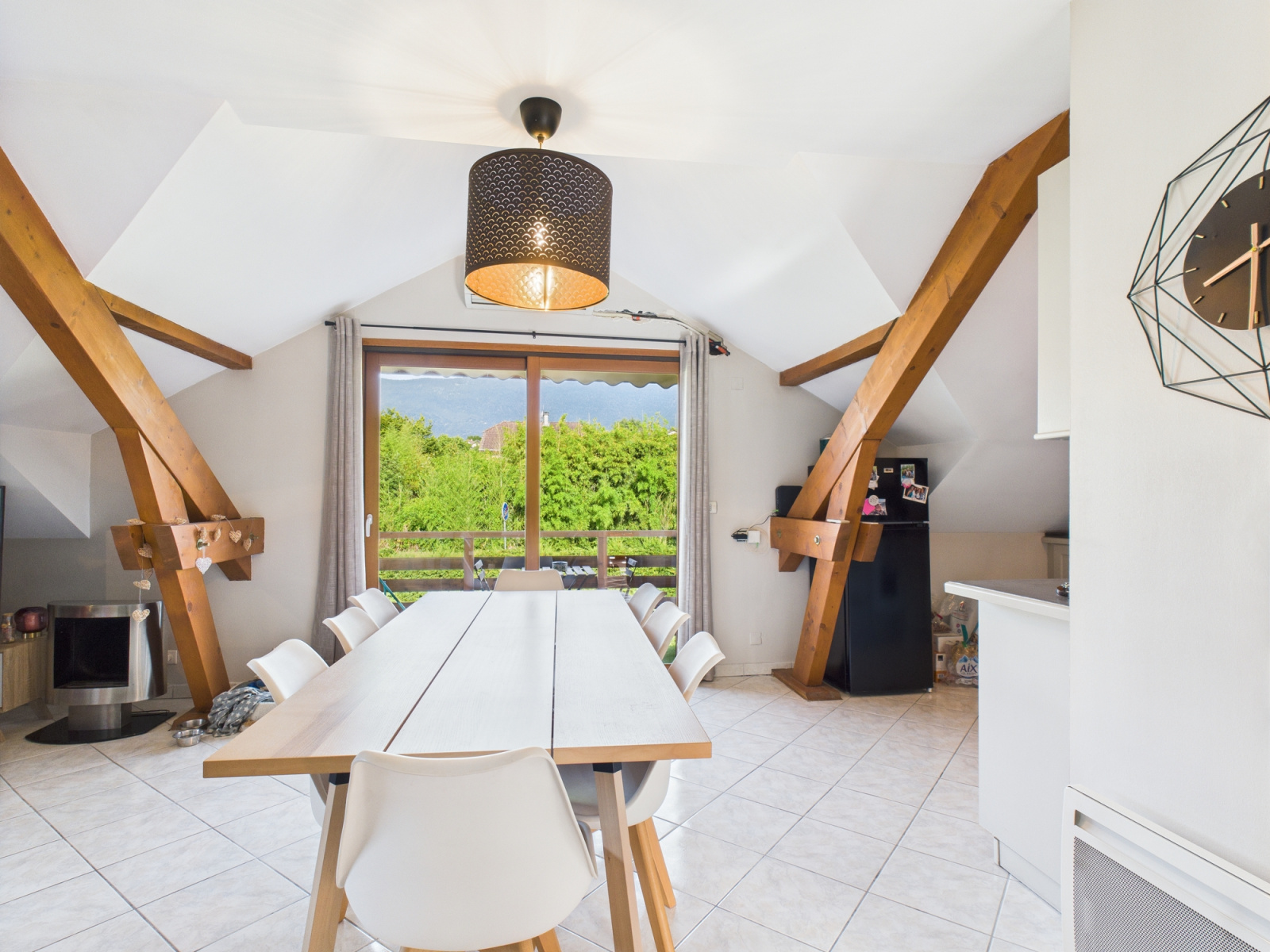 Il se compose d’un lumineux séjour avec poutres apparentes, offrant une atmosphère chaleureuse et accueillante, ouvert sur un petit balcon avec une vue dégagée sur la majestueuse Dent du Chat.